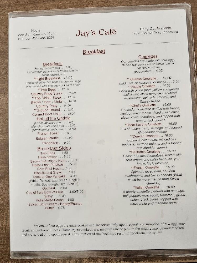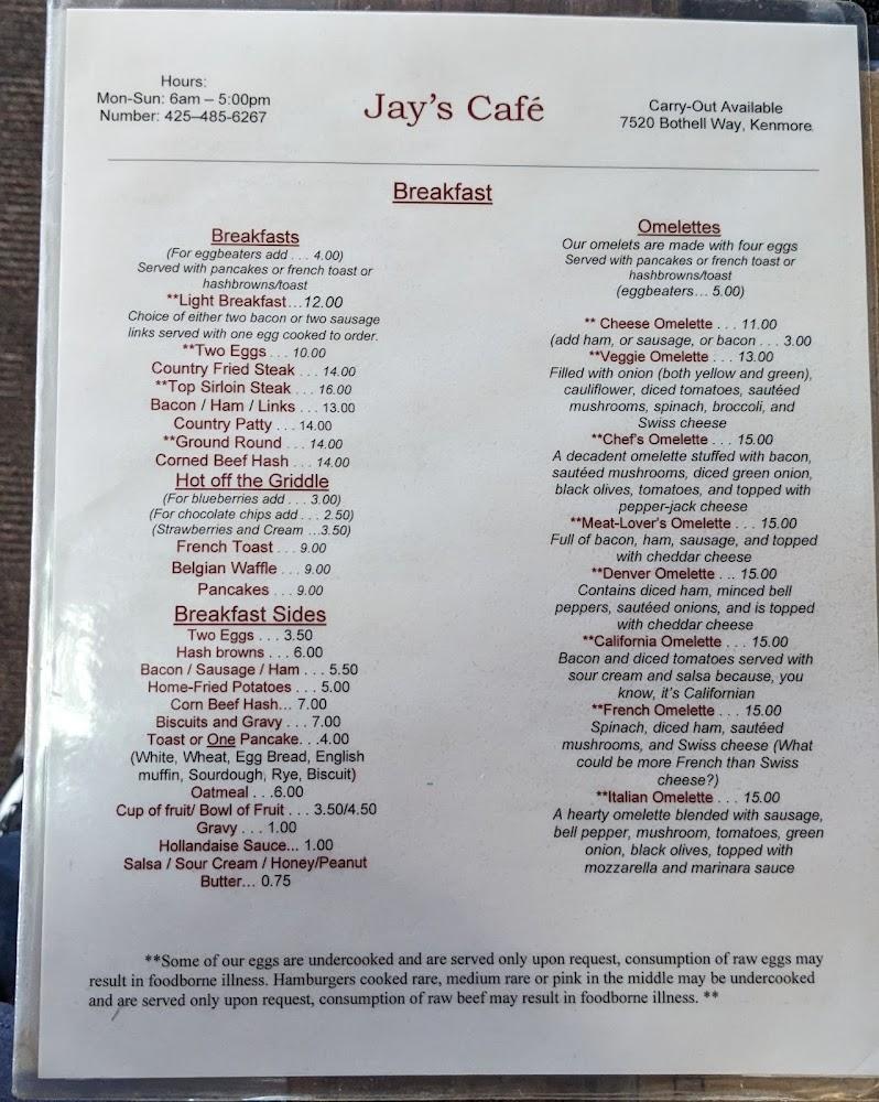 Welcome to Jay's Cafe, your go-to destination for a delightful dining experience in Kenmore, WA. Located at 7520 NE Bothell Way, we specialize in American cuisine, serving up mouthwatering breakfast, lunch, and dinner options in a relaxed setting. With a commitment to excellent service, our friendly staff ensures quick dining whether you're here for a solo meal or with family and friends. Enjoy our local specialties alongside freshly brewed coffee, or indulge in our delicious desserts. We offer convenient amenities including takeout, delivery, and accessible seating, making Jay's Cafe a perfect choice for everyone. Come discover your new favorite spot!