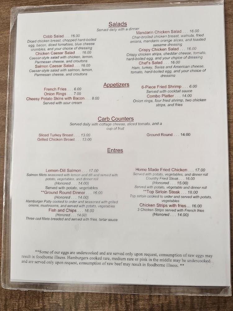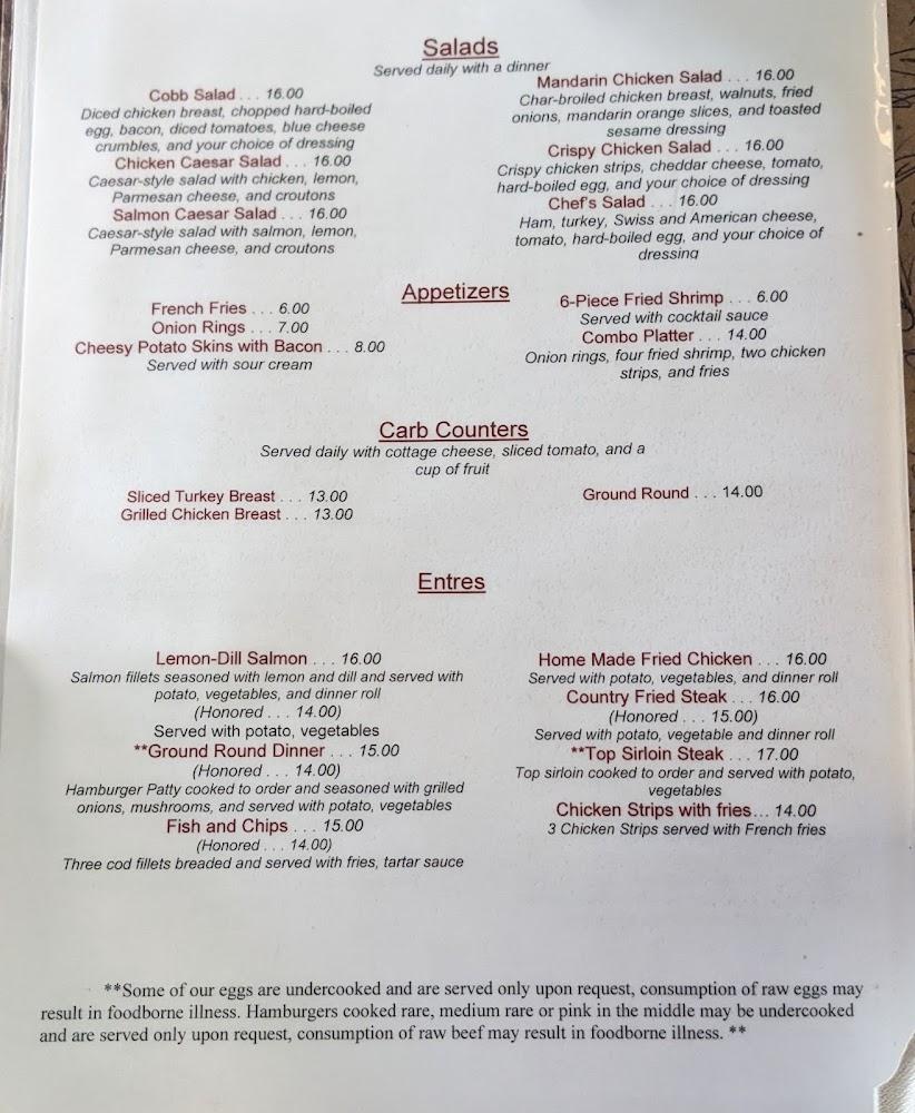 The dessert options provide a sweet finish to meals, featuring classics like pie and ice cream. Beverage selections include fresh coffee, juices, and specialty drinks. With a kid-friendly menu, there's something to satisfy everyone. Regular tools for patrons include seasonal specials that keep offerings fresh and exciting.